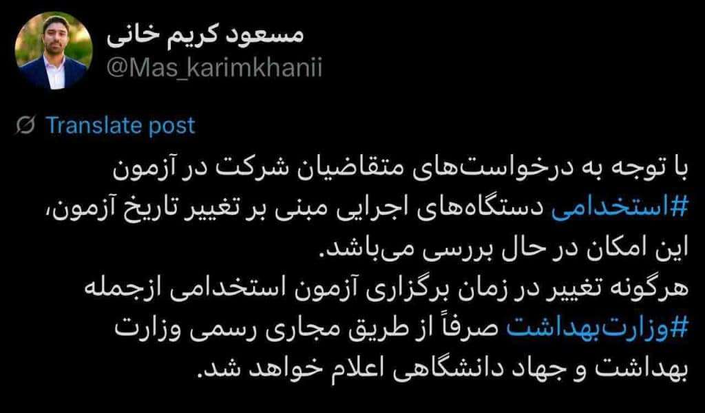 به گزارش اخبارکار به نقل از شناسنامه قانون ، مسعود کریمخانی در شبکه ایکس نوشت:“با توجه به درخواستهای متقاضیان شرکت در آزمون استخدامی دستگاههای اجرایی مبنی بر تغییر تاریخ آزمون این امکان در حال بررسی میباشد.