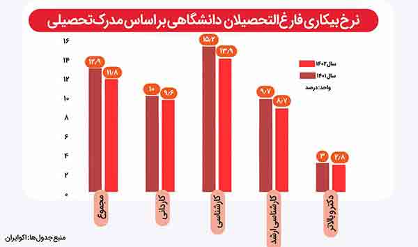 طبق داده‌های مرکز آمار، در سال ۱۴۰۲، ۵/۱۴ درصد از دانشجویان و فارغ التحصیلان رشته‌های علوم تجربی، ریاضیات و آمار که در جمعیت فعال کار حضور داشتند، بیکار بوده‌اند. جمعیت فعال به مجموع جمعیت شاغل و بیکار اطلاق می‌شود، بنابراین نرخ بیکاری فارغ التحصیلان این رشته ۵/۱۴ درصد و بیشتر از سایر رشته‌های دانشگاهی بوده است. در سوی دیگر این طیف، فارغ التحصیلان حوزه بهداشت قرار گرفته‌اند که نرخ بیکاری آنان، نزدیک به نرخ بیکاری کل کشور در محدوده ۳/۷ درصد قرار گرفته  است.