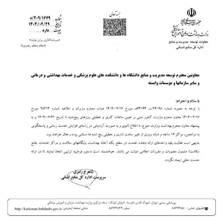 با توجه به مصوبه شماره ۲۶۰۹۸/۶۴۱۶۴هـ مورخ ۱۴۰۴/۰۲/۱۷ هیات محترم وزیران و ابلاغیه شماره ۲۸۲۱۳ مورخ ۱۴۰۴/۰۲/۱۷ معاون محترم وزارت کشور مبنی بر تعیین ساعات کاری و تعطیلی روزهای پنجشنبه تا تاریخ ۱۴۰۴/۰۶/۳۱ و به پیشنهاد معاون محترم بهداشت وزارت متبوع تا اطلاع ثانوی و به صورت آزمایشی در راستای افزایش خدمترسانی و پاسخگوئی به مراجعین مراکز ۱۶ ساعته و شبانهروزی از تغییر ساعت اداری و تعطیلی پنجشنبهها مستنتی بوده و فعال خواهند بود.