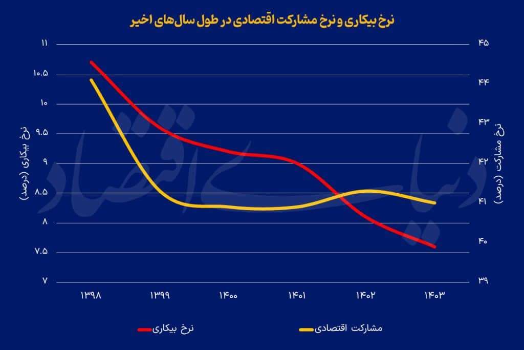 مرکز آمار ایران بهتازگی آمارهای مربوط به بیکاری سال ۱۴۰۳ را اعلام کرد. اگرچه پیش از این آمارهای مربوط به بیکاری فصل زمستان منتشر شده بود، بااینحال، آمارهای مربوط به نرخ بیکاری در سال ۱۴۰۳، بهتازگی اعلام شده است. براساس این آمار، نرخ بیکاری در سال ۱۴۰۳، ۷٫۶درصد بوده است که حاکی از کاهش ۰٫۵واحد درصدی این متغیر نسبت به سال قبل است. اگرچه در نگاه اول به نظر میرسد این امر نشانگر بهبود وضعیت بازار کار در کشور است، با این حال، همزمان با کاهش بیکاری، نرخ مشارکت اقتصادی، یعنی جمعیت فعال جویای کار کشور (اعم از شاغل و بیکار) نیز با کاهش ۰٫۳واحد درصدی روبهرو بوده است. به این ترتیب میتوان گفت کاهش نرخ بیکاری در کشور، لزوما ناشی از رشد اشتغالزایی در کشور نبوده است.