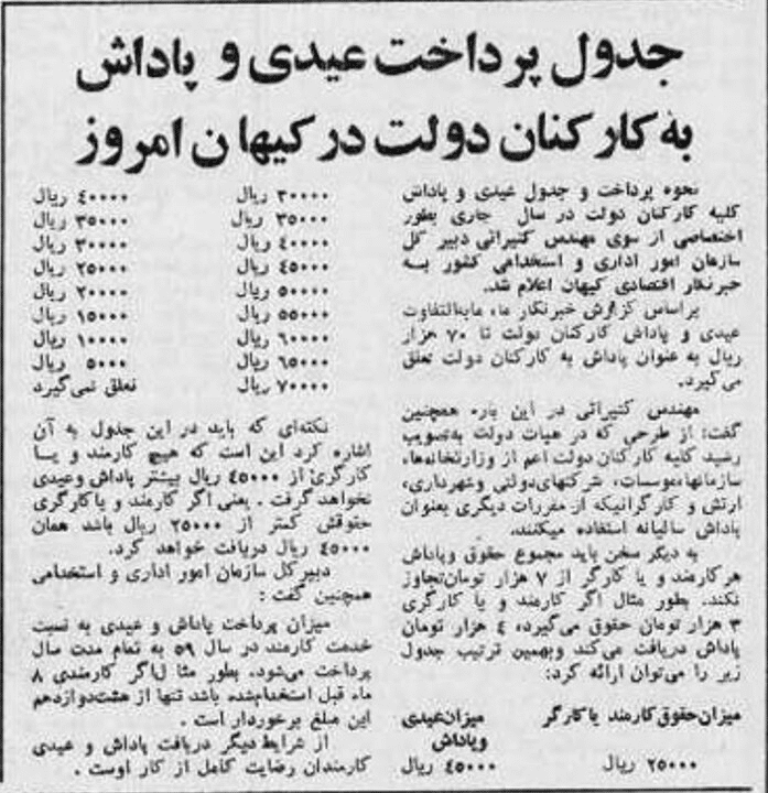 در ادامه جدول پرداخت عیدی و پاداش به کارگران و کارکنان دولت در کیهان به تاریخ ۱۳ بهمن ۵۹ را از نظر میگذرانیم: